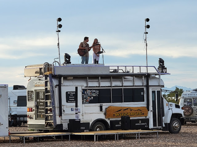 | This converted bus has a sitting area on top that was being used as a stage. There were at least 3 more of this type that people would gather around and listen to various types of music. |